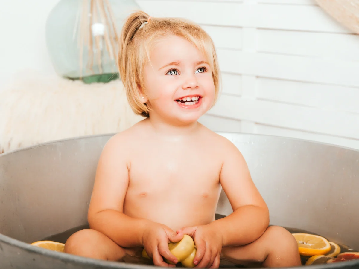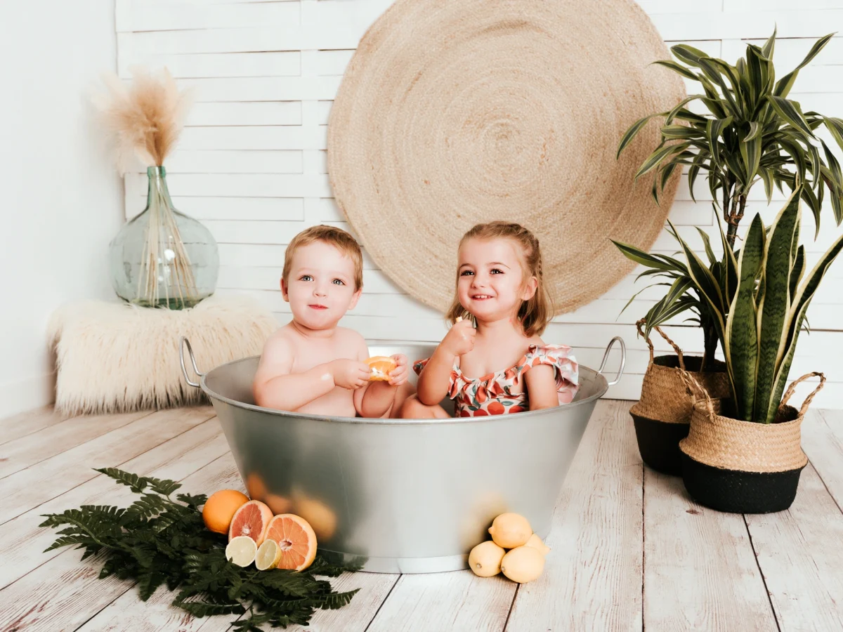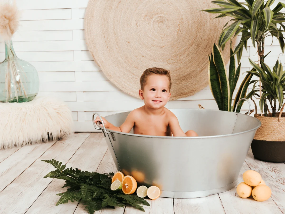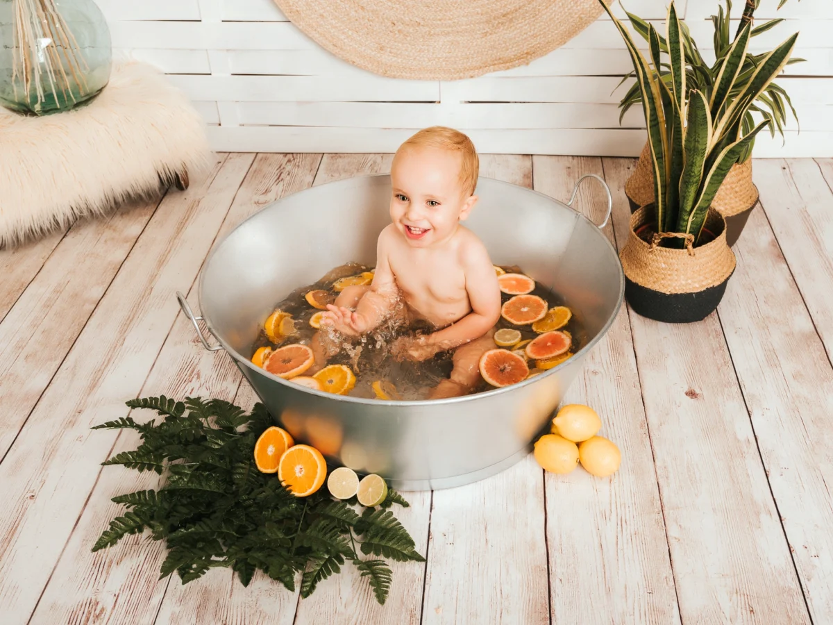 Sabemos que se lo pasará divinamente pintando y guarreando con los distintos colores y que terminará con más manchitas sobre su piel que un dálmata. Cuando ya no quiera pintar más, pasaremos a la segunda parte de la sesión, un estupendo baño entre rodajas de frutas cítricas. Dispondremos de un barreño lleno de agua calentita y un montón de rodajas de fruta para que chapotee y juegue a sumergir la fruta. De paso aprovecharemos para limpiarle toda la pintura que tenga por los bracitos, pies, etc. para que se vaya de nuestro estudio tan limpio como llegó.